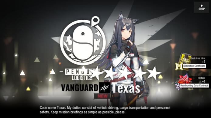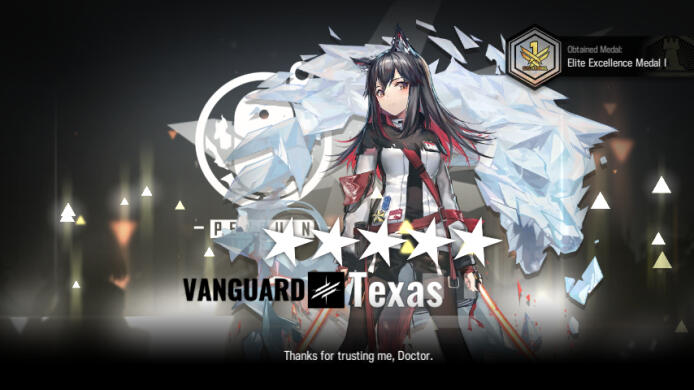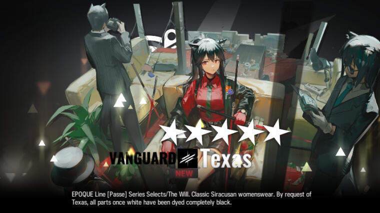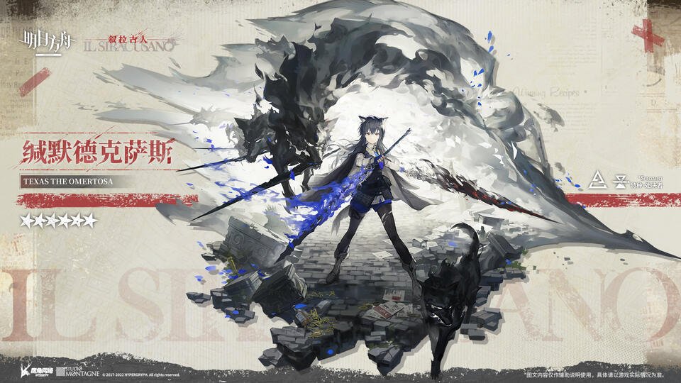 Miss Texas is quiet, though her combat style is anything but. It's best described as a tempest.At Rhodes Island, Operators without formal training are actually the majority, but when it comes to weapon applications, most will follow the common protocol. Texas, however, doesn't.While she is a bit more reserved now, one can still see vestiges of her habits that she might not be aware of - her belief that the singular purpose of all weaponry is to kill.Her Lupo origin, her conspicuous fur color, her notable combat style, and of course, her name, all point to her ties with the faded Texas family, a once-famous clan whose name is now forgotten to most.If that's the case, Texas's past is probably astonishing beyond imagination, as indicated by the Texas name itself.On one hand, even with Rhodes Island's intel network, very little is known about the family's fate. On the other hand, Texas never felt the need to elaborate her past, so there isn't a pressing need to delve into it. After all, her past may one day catch up to her, just as she predicts.